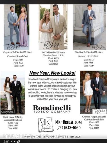 Here at MK Bridal we offer suit/tuxedo rentals for the wedding party. Rentals of 5 or more suit/tuxedos you get one free. Rentals include Suit, tie, pants and shirt starting at $160-$190. additional rentals for shoes, suspenders, cuff links, and pocket squares,